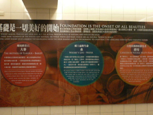 牆上貼滿了威士忌酒的製造過程海報