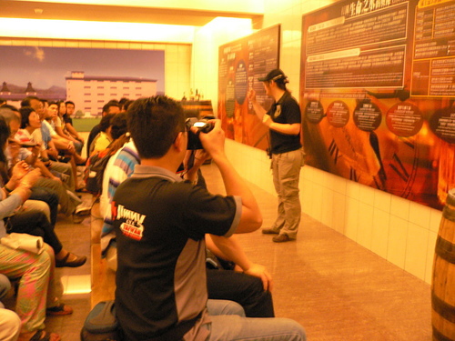參觀的遊客解說威士忌的製造過程