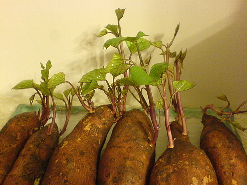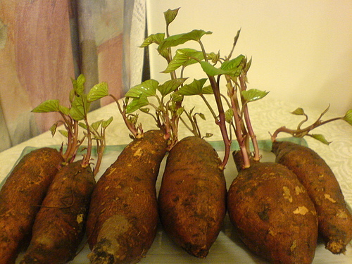 老媽種的地瓜不知放了多久 才想拿來煮地瓜粥 竟然發現它已長芽了